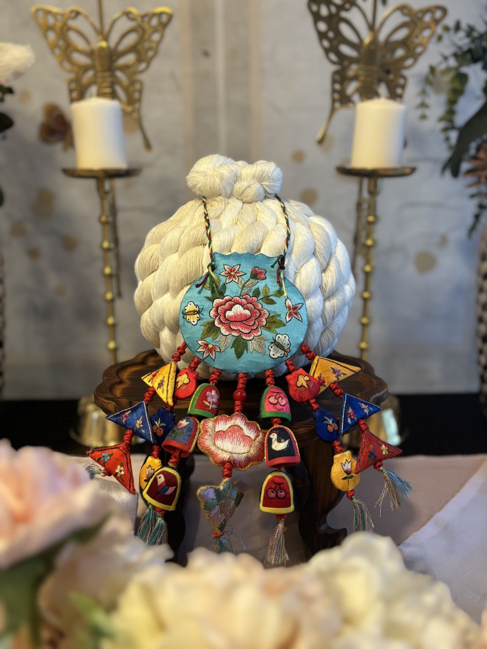 전통민화 현수막, 전통나비 촛대2개,